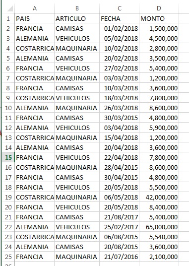 En la hoja de cálculo Excel digita los siguientes datos, formatear los datos de la fecha para que se observe como en la imagen y la del monto en formato de moneda y que muestre los separadores de miles, recuerde que no debe ingresar ni coma, ni punto en los datos numéricos.