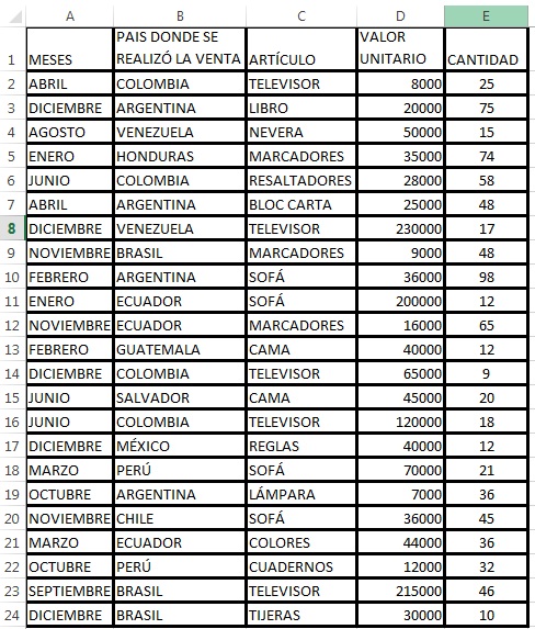 Digitar los siguientes la base de datos la hoja de cálculo.