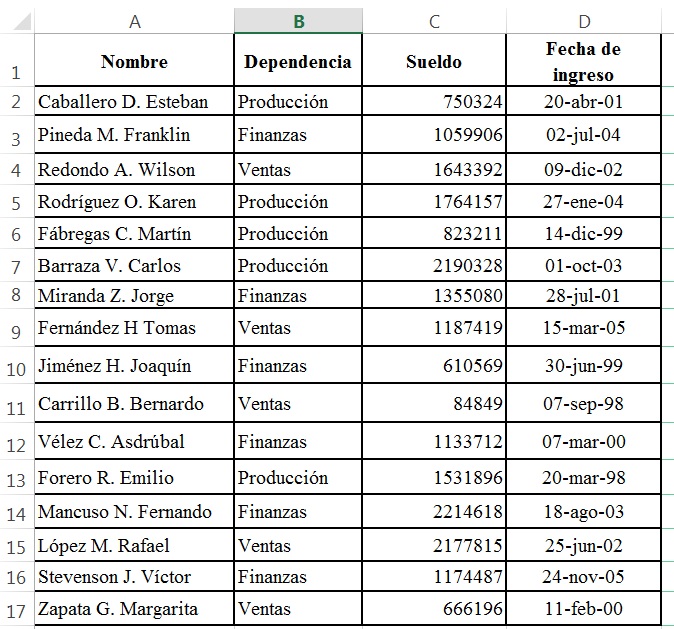 - Dele el formato de moneda a los datos de sueldo, con el simbolo de pesos, con separador de miles y cero cifras decimales. a las fechas aplíqueles formato de fechas separada con / slash.