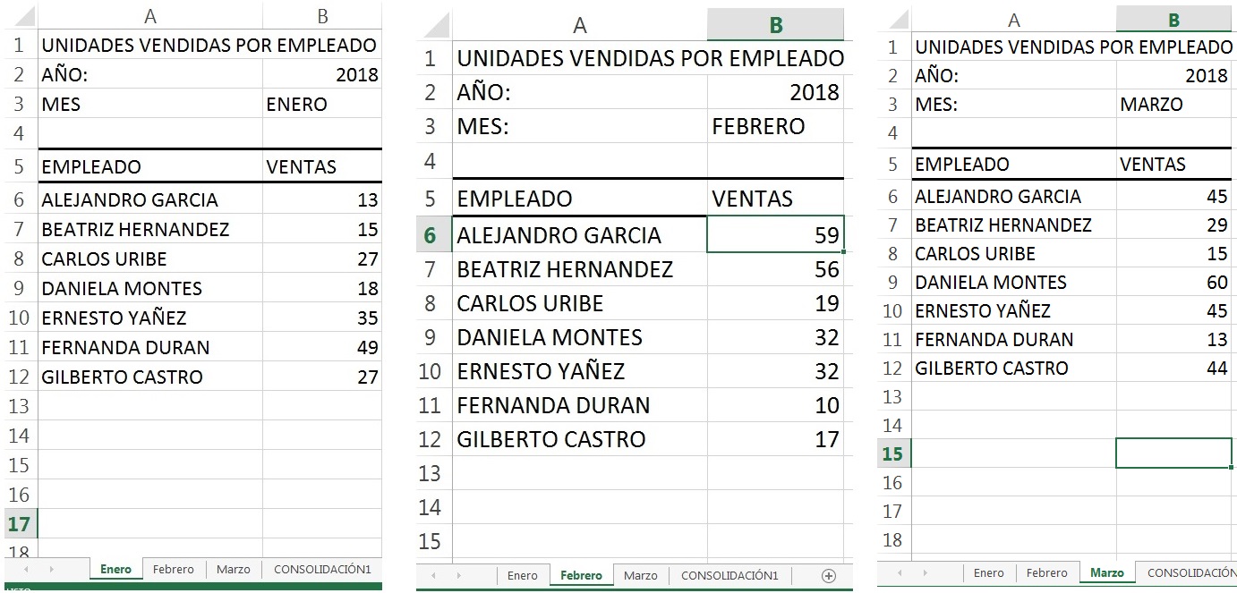 - atos pueden estar en diferente orden, Las funciones se ponen de forma automática. Al tener vínculos con las hojas que le dan origen a la consolidación, se pueden modificar las cantidades de las hojas de origen y se actualiza la hoja consolidada.