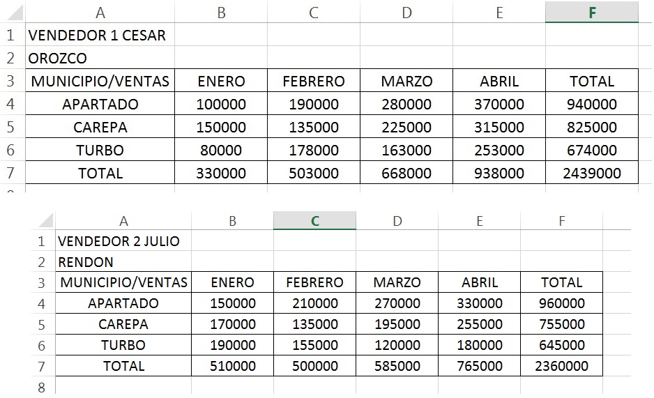 Se tienen 2 archivos de 2 libros que han envíado 2 vendedores, digitar los datos del vendedor1 en un libro que llamará vendedor1 y los datos del vendedor 2 en un libro que llamará vendedor2, los cuales tenemos que tener en cuenta que deben ser totalmente idénticos, deben de manejar el mismo encabezado, los mismos números de filas en las mismas posiciones solo va a cambiar la información de cada vendedor y además observar que los datos deben estar ubicados en las mismas celdas como se muestra en la imagen. Lo que se busca es resumir en un libro nuevo se busca resumir lo que se tiene fraccionado en diferentes libros. Se debe consolidar la información de los dos vendedores en un nuevo archivo que se llamará Consolidación vendedores 1 y2.