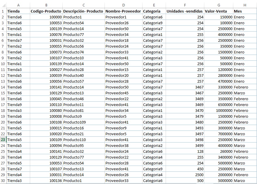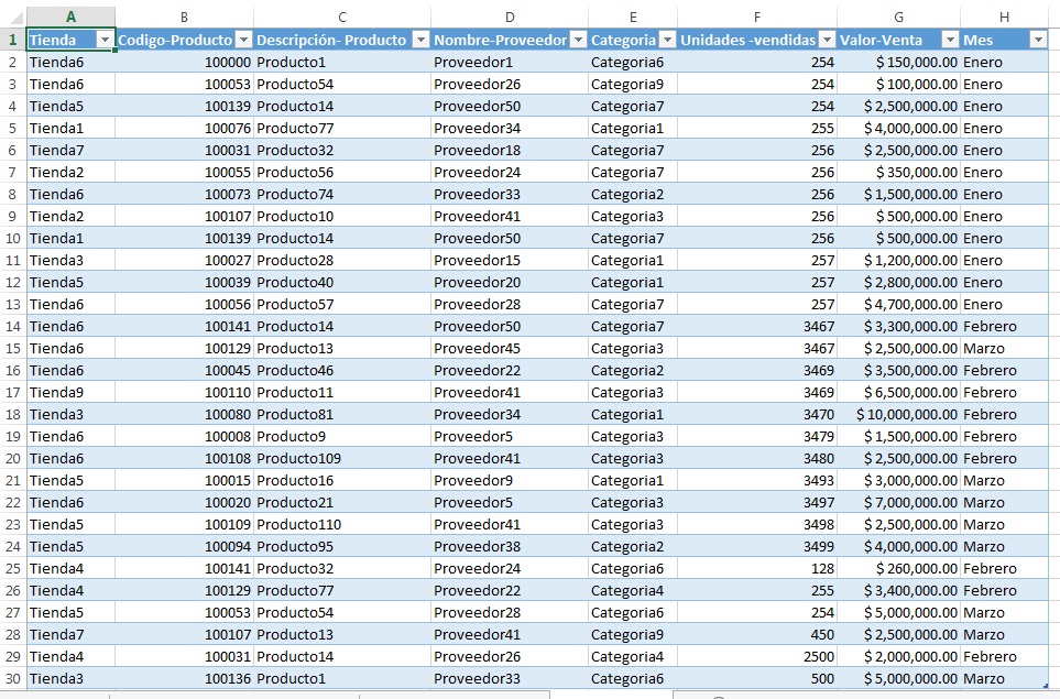 Al formatear como tabla y dar formato de moneda a la columna Valor-venta los datos deben quedar asi: