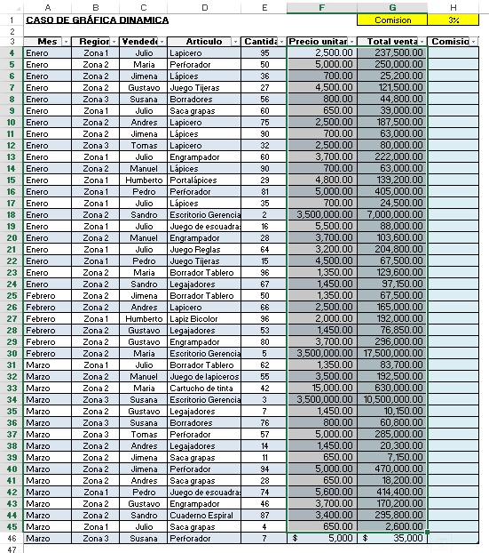 - Debes programar una fórmula que permita encontrar las comisiones obtenidas por cada venta, teniendo en cuenta que corresponden al 3 % de la venta.